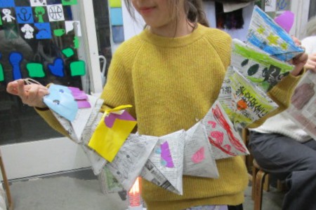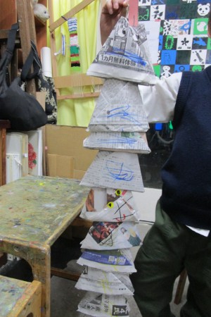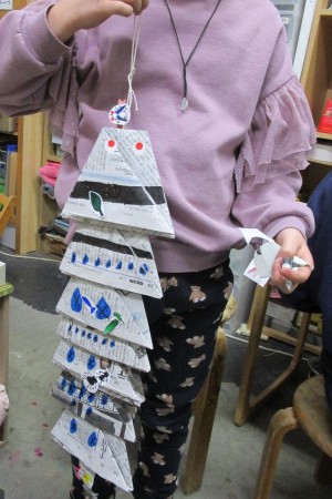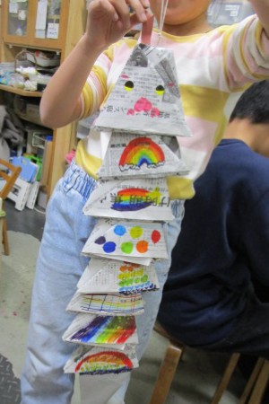 新聞紙を折ってつないで大きなヘビを作りました。